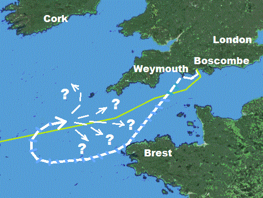 Portland from the East, using Dick's AA16PATH.KML on Google Earth. Later Wind & Tide analysis shows Snoopy may have travelled south, to left, towards Portland Bill.