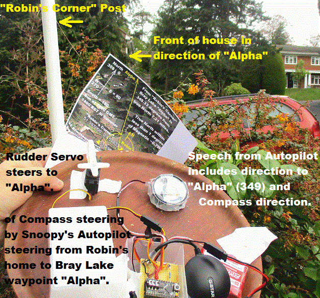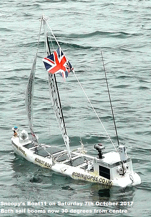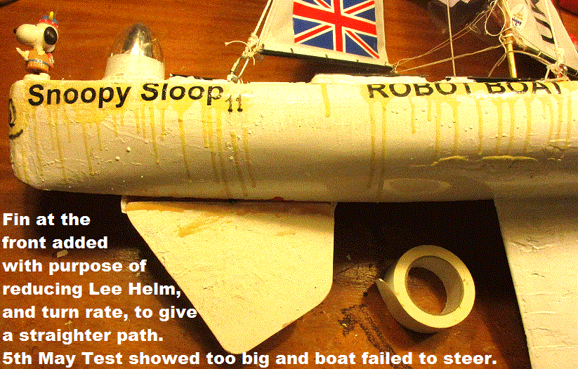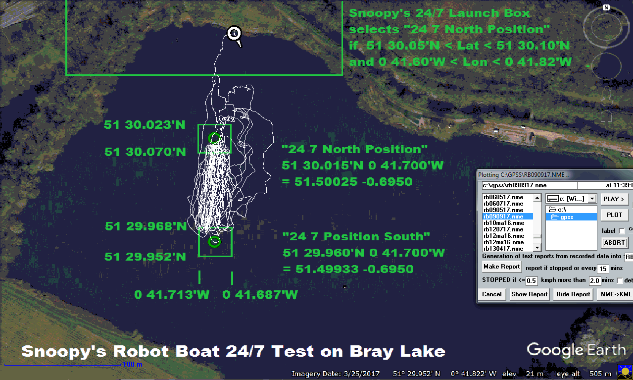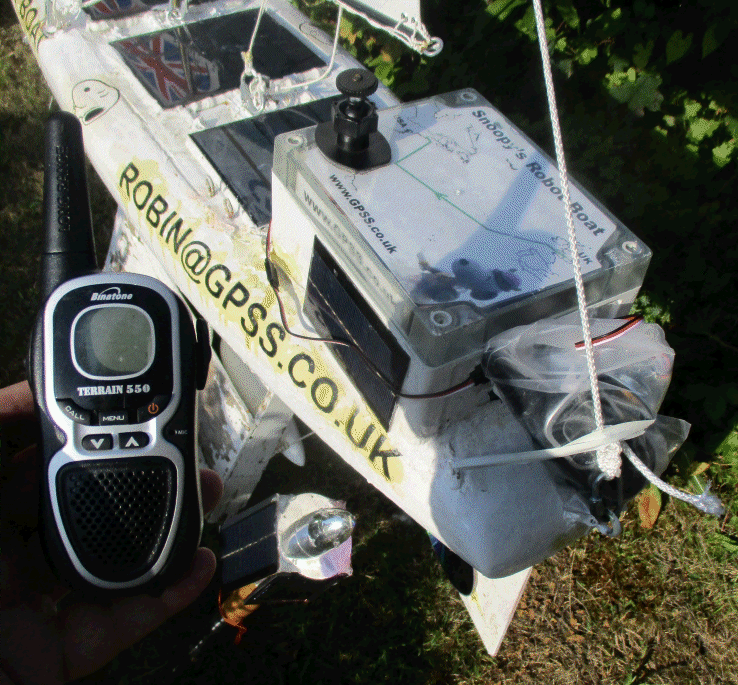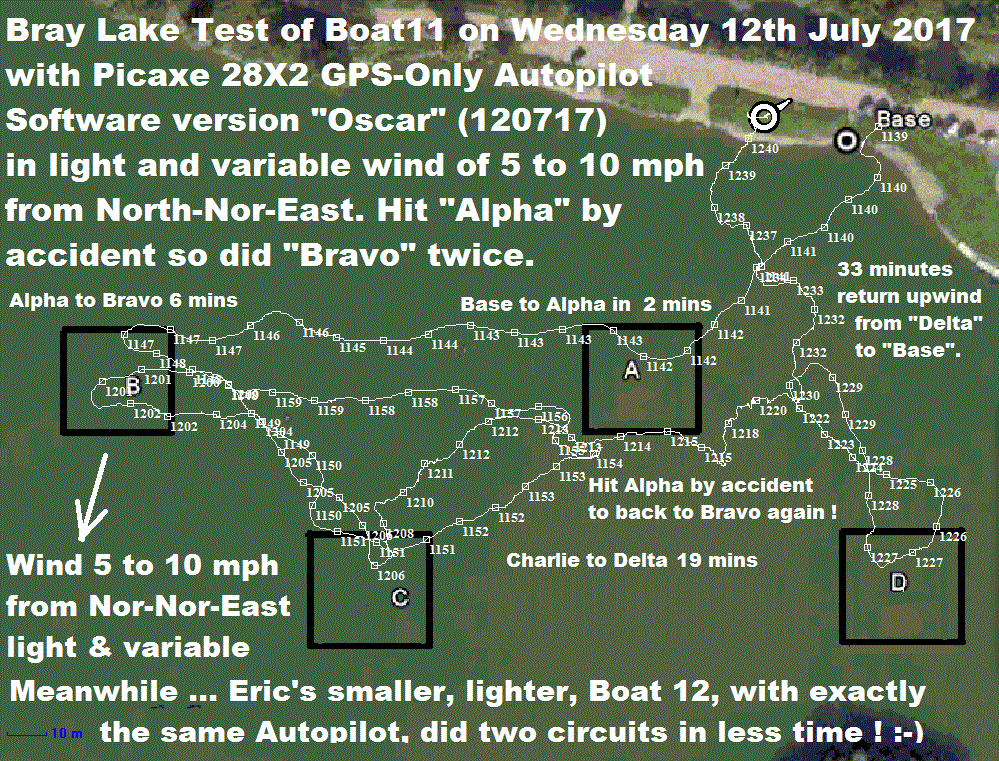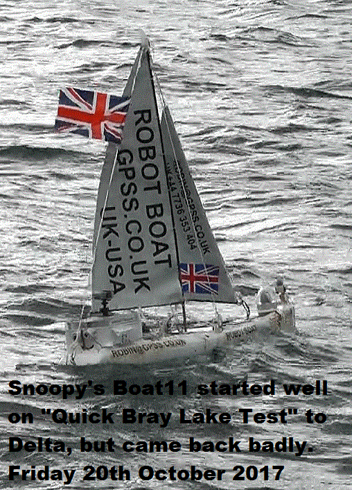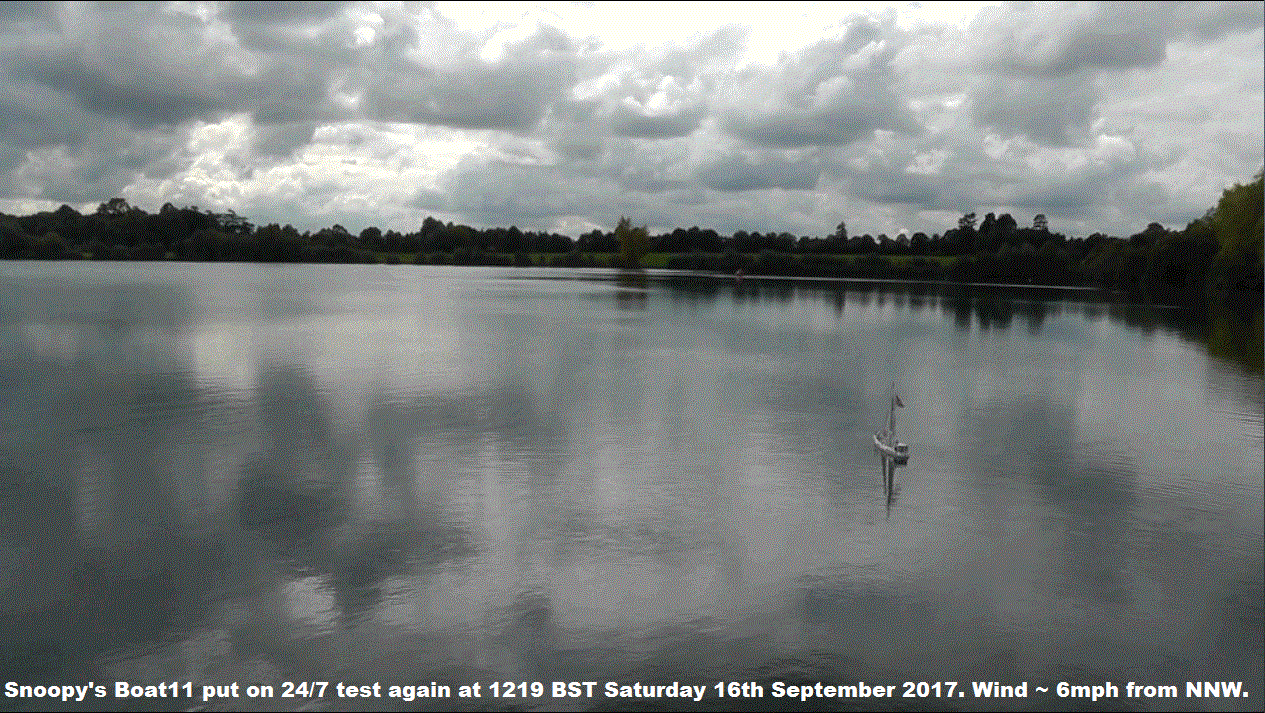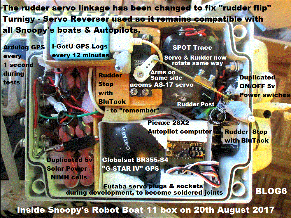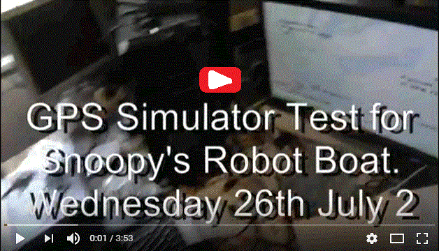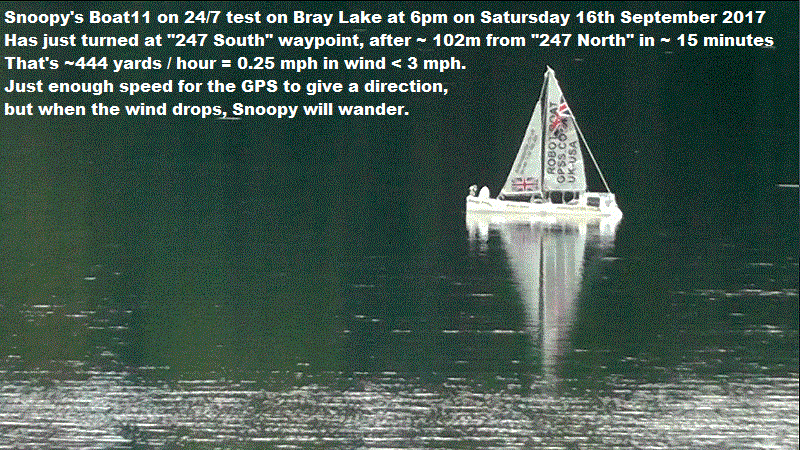 Last, but not least, little "Affinity", just 0.65 metres long, and Snoopy's most recent robot boat featured on Eric's Page including it doing the Bray Lake Test ! I could not resist copying the Youtube video to here: check it out on the right ! :-) Affinity has the same Picaxe 08M2 + old BR-355 GPS used in recent Atlantic Attempts, including that in October 2016. It settles down into it's control loop, speaking directions and steering to Bray Lake. It does not speak speed because memory was so tight - even the startup title was cut down to only "15 2" !
