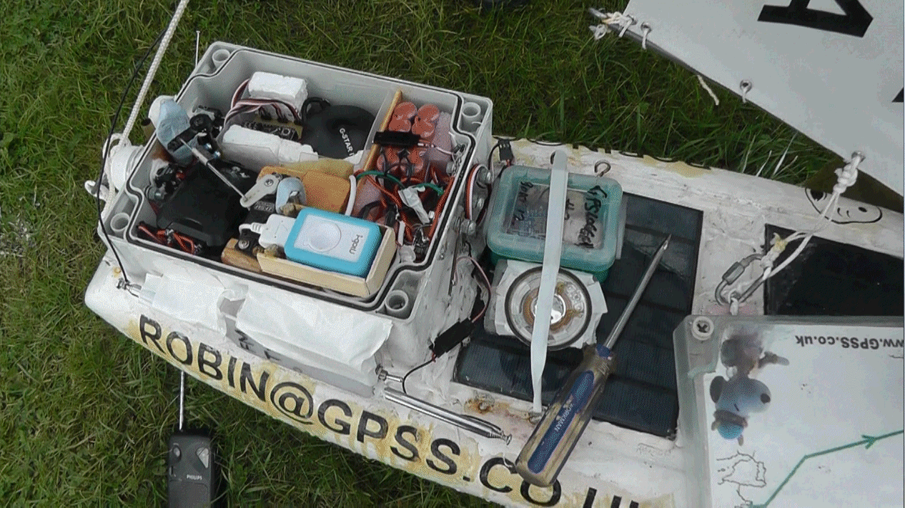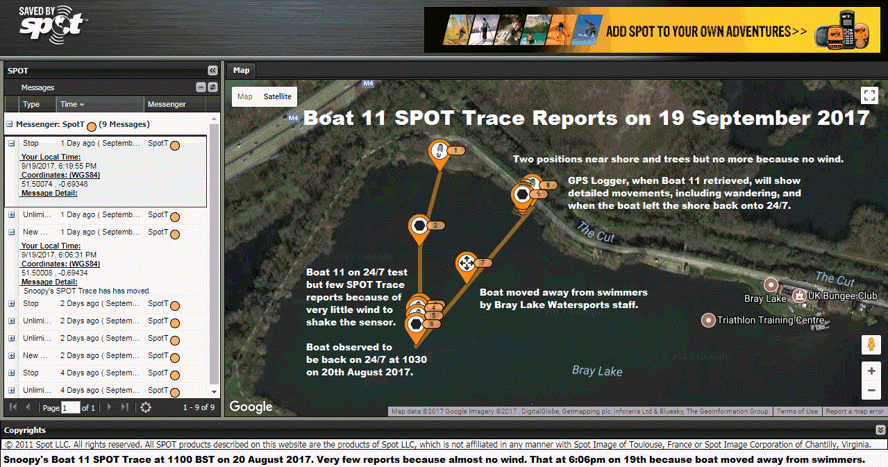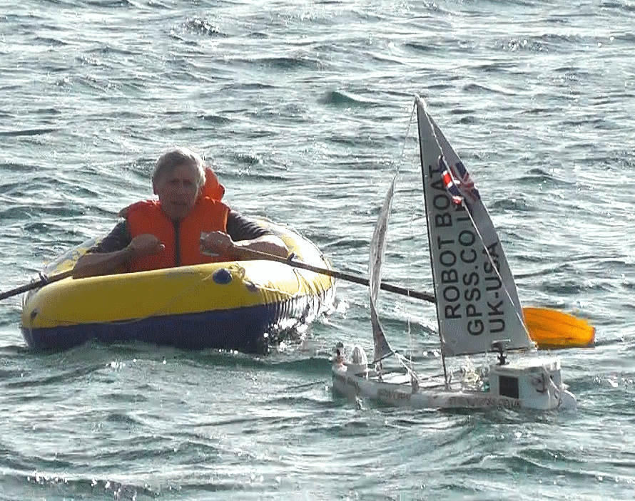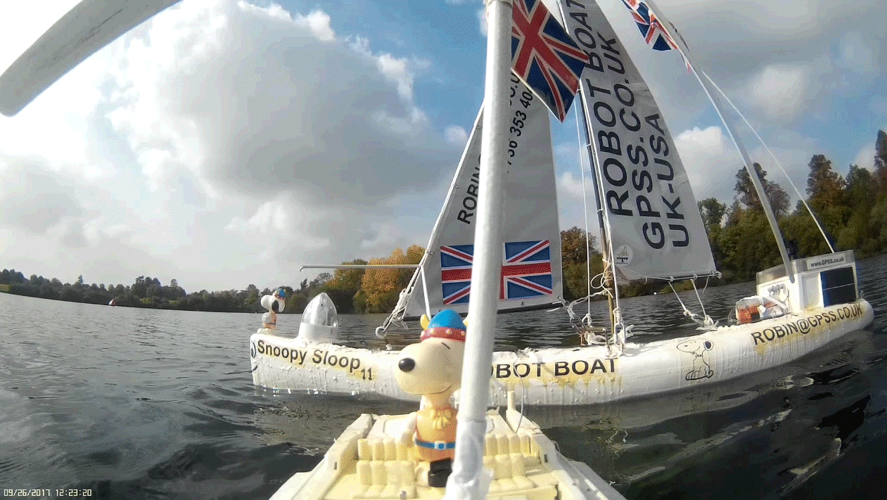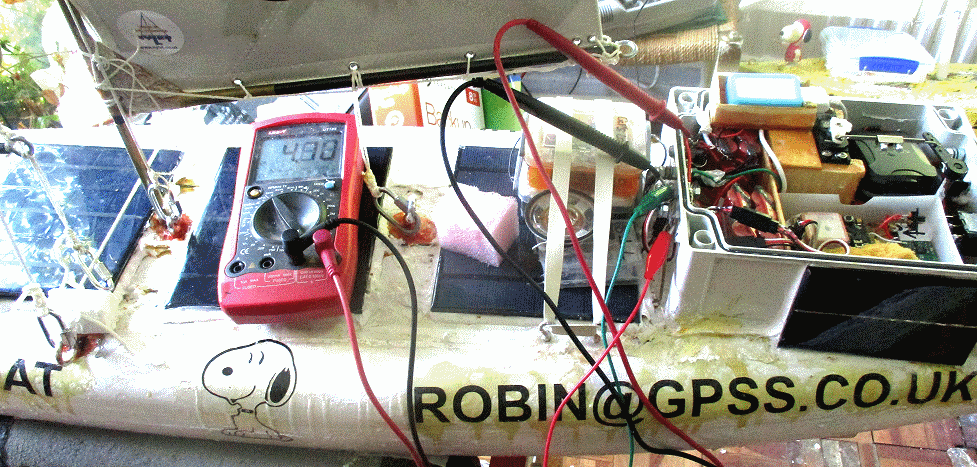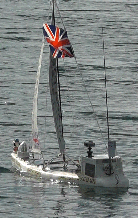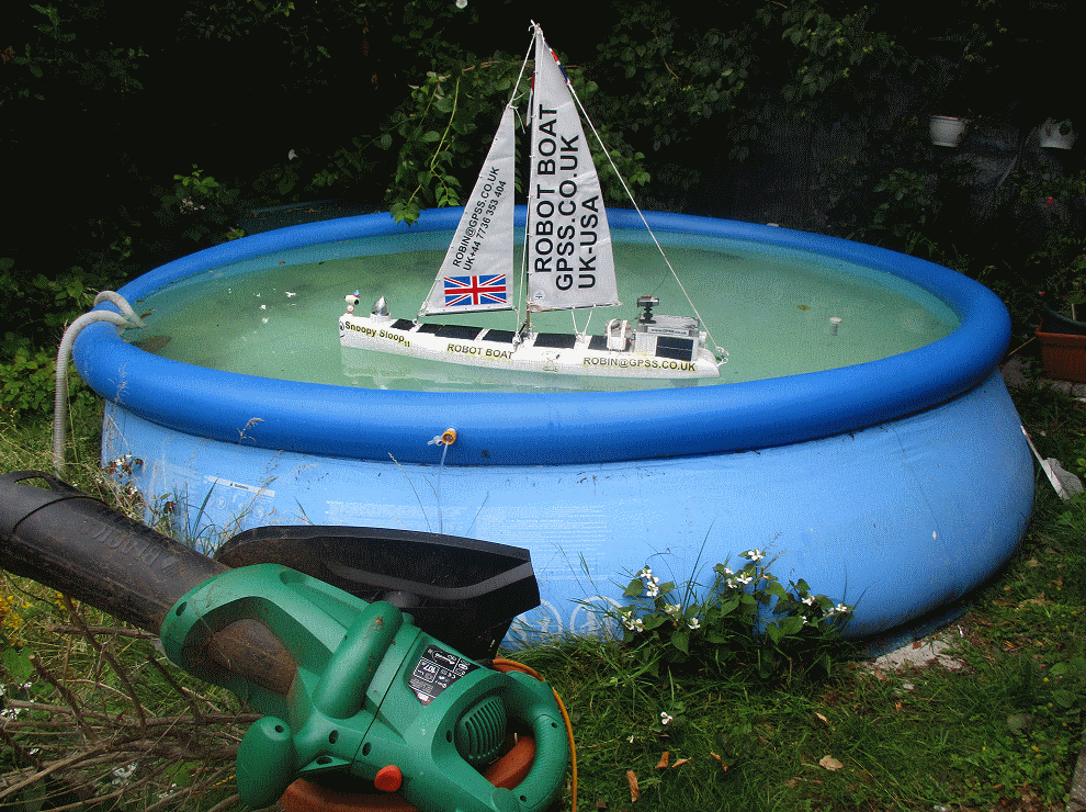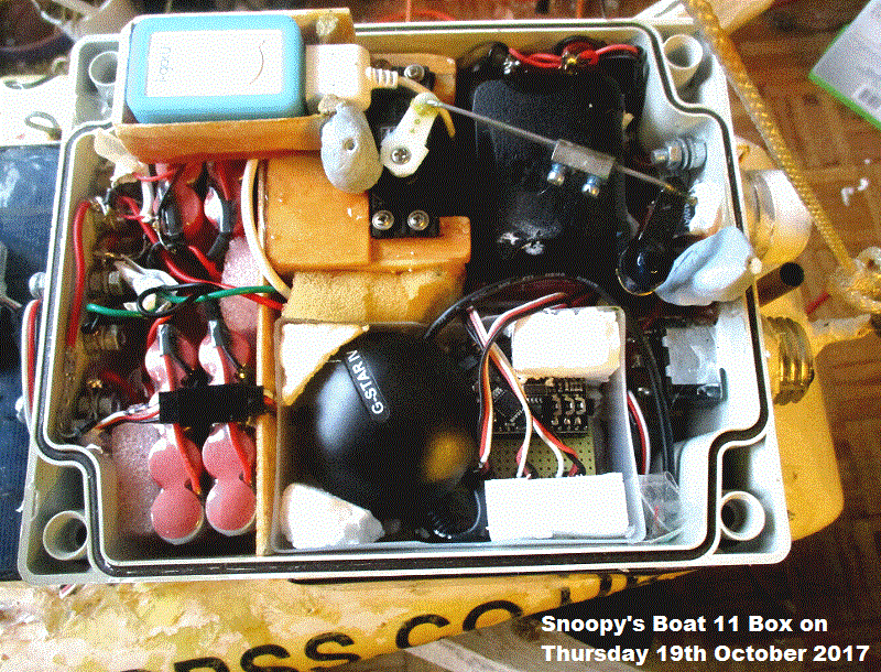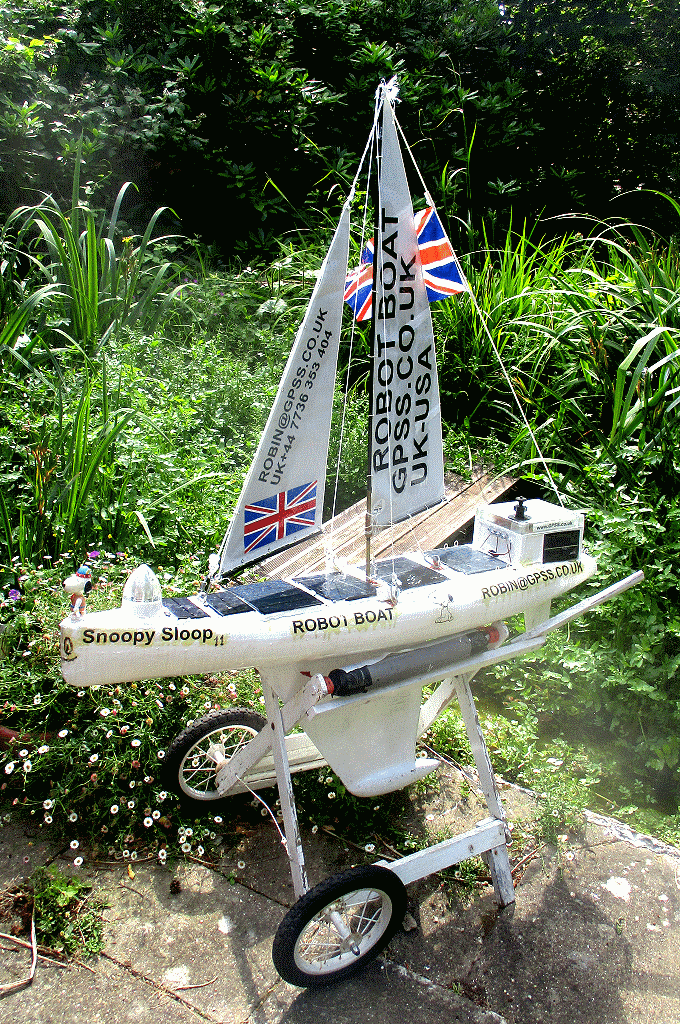 Last, but not least, little "Affinity", just 0.65 metres long, and Snoopy's most recent robot boat featured on Eric's Page including it doing the Bray Lake Test ! I could not resist copying the Youtube video to here: check it out on the right ! :-) Affinity has the same Picaxe 08M2 + old BR-355 GPS used in recent Atlantic Attempts, including that in October 2016. It settles down into it's control loop, speaking directions and steering to Bray Lake. It does not speak speed because memory was so tight - even the startup title was cut down to only "15 2" !