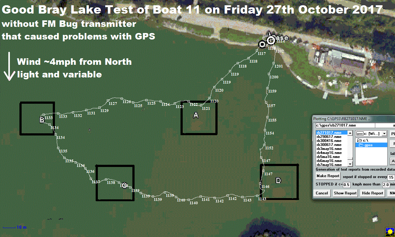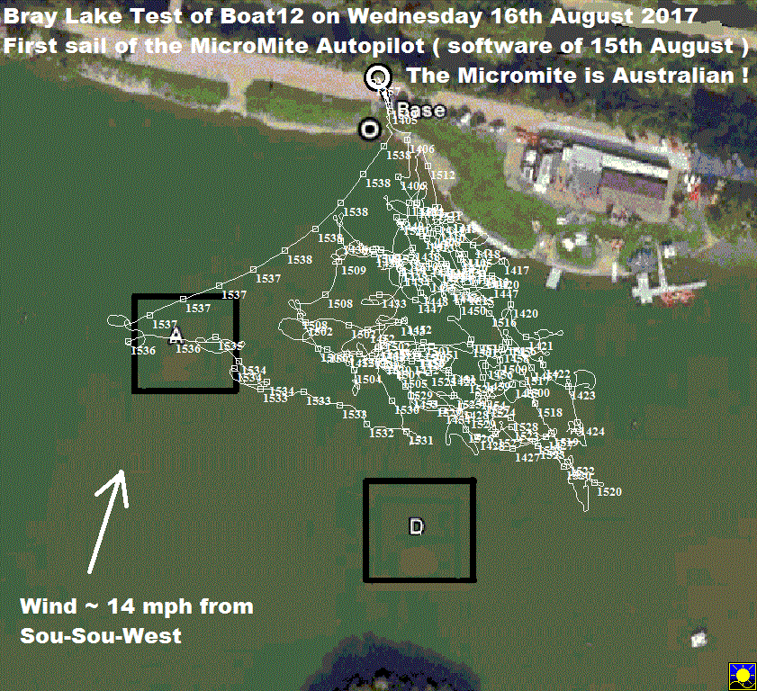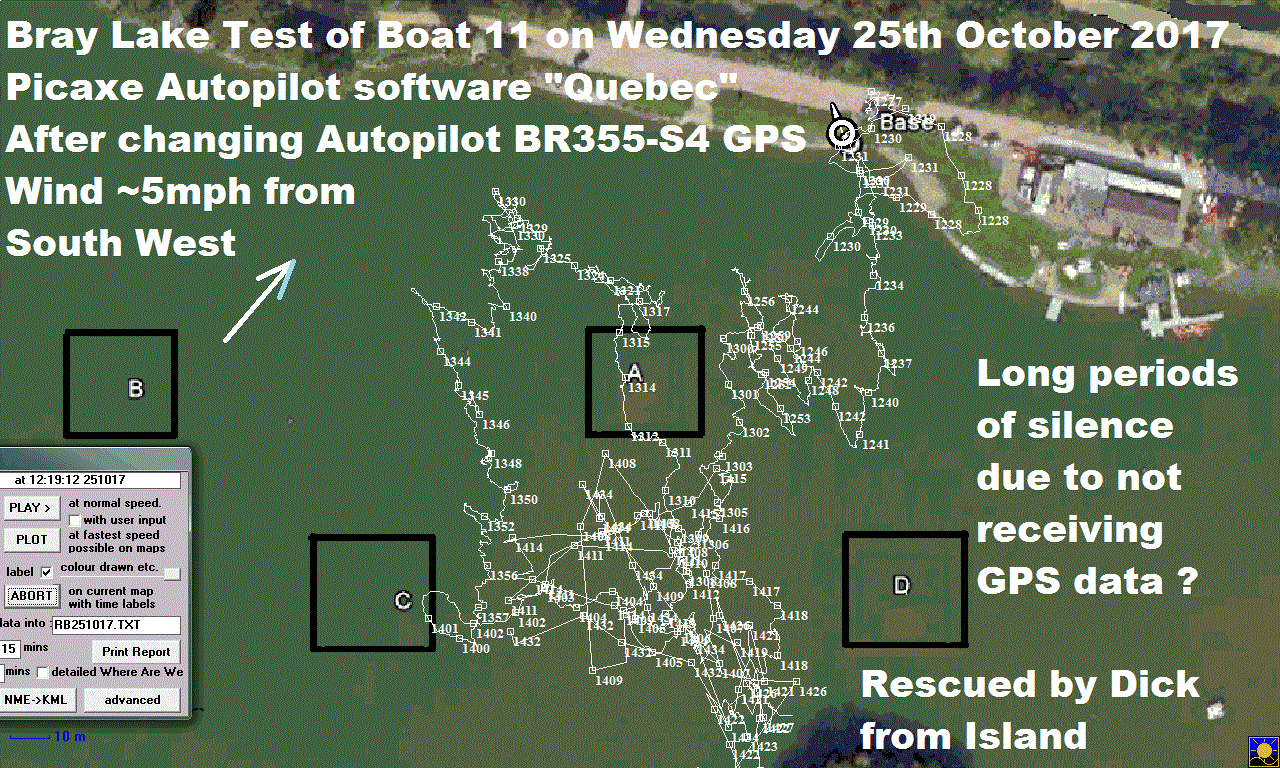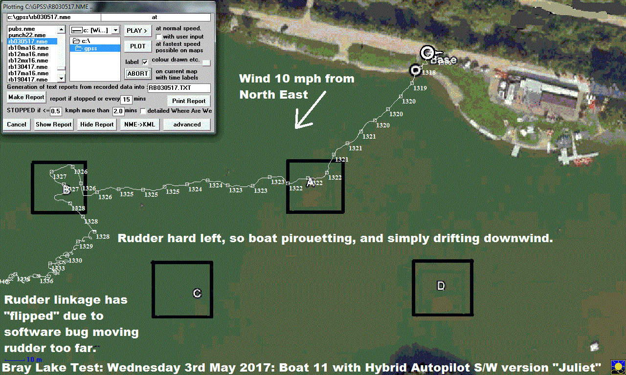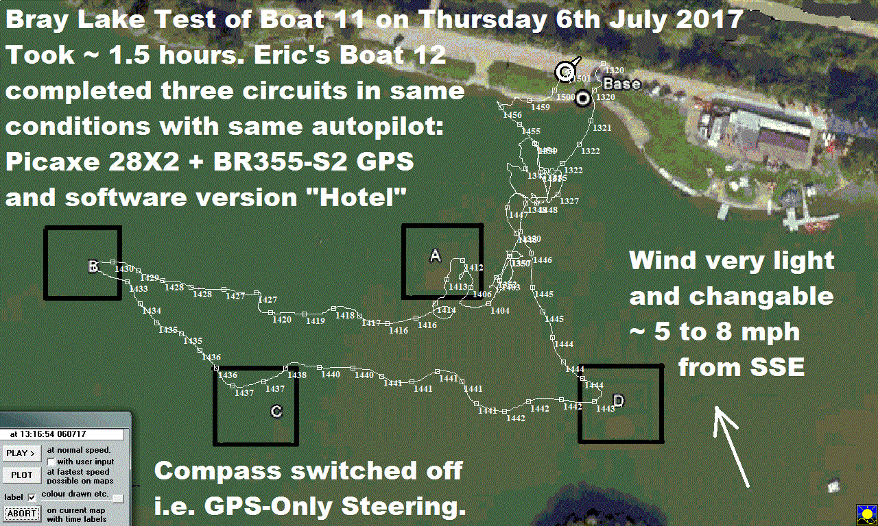 Boat6 ( yellow on left ): plugging in a TTS unit and switching on, made it speak "Autopilot for 28X2, 12th March 2016". Looking inside the Autopilot box we could see no compass and the old Globalsat BR355 GPS, used in all previous attempts. Looking at the "Change History" in the code, we can see that AP28X2D was after having two 24/7 waypoints on Bray Lake instead of one. AP28X2E removed Armitage Court waypoint, to make space for Goldsworth Park ones. i.e. our latest AP28X2F should be the same as that in Boat 6, other than the GPS. Boat6 then settled down into it's control cycle, steering to Bray Lake "A", saying speed was either 0.0 or 0.1 knots. This implies our old BR355 may have been accurate to 0.1 of a knot. i.e, direction errors no more than 45 degrees at 0.1 knots, decreasing to below 10 degrees above 0.5 knots real speed. Maybe the new BR355-S2 will be better: hence our wish for tests on this speed accuracy soon.