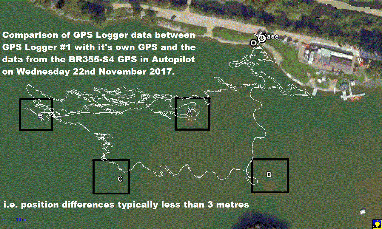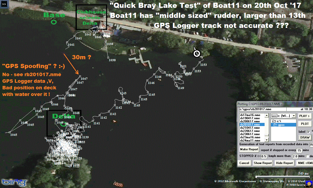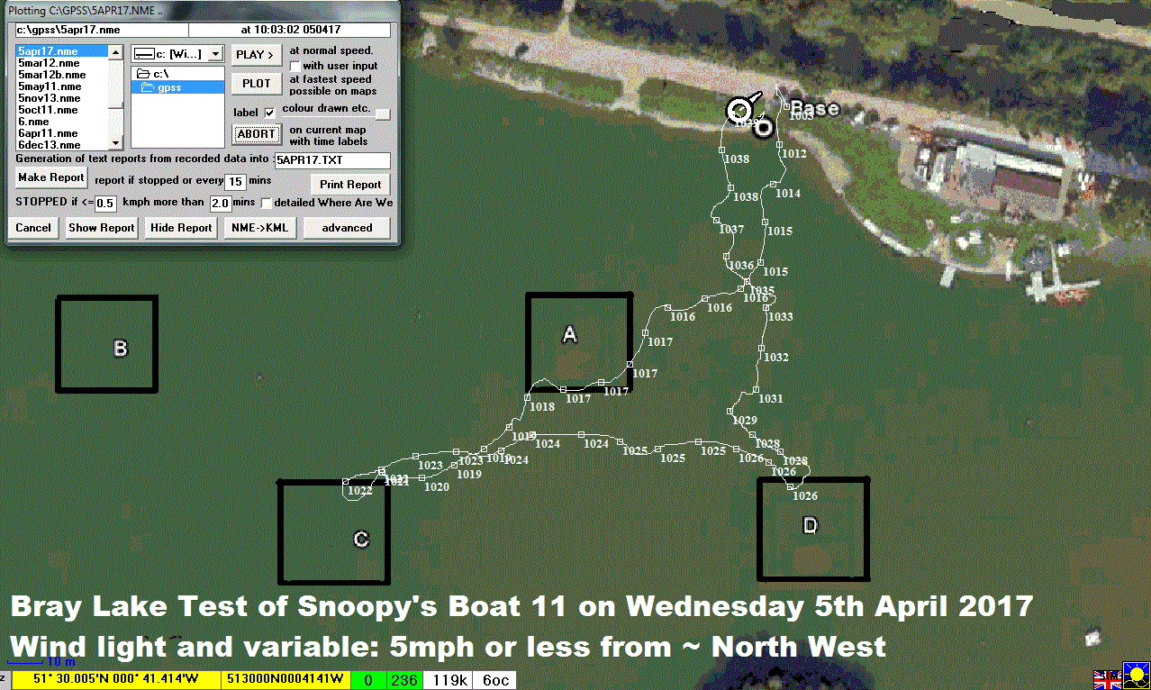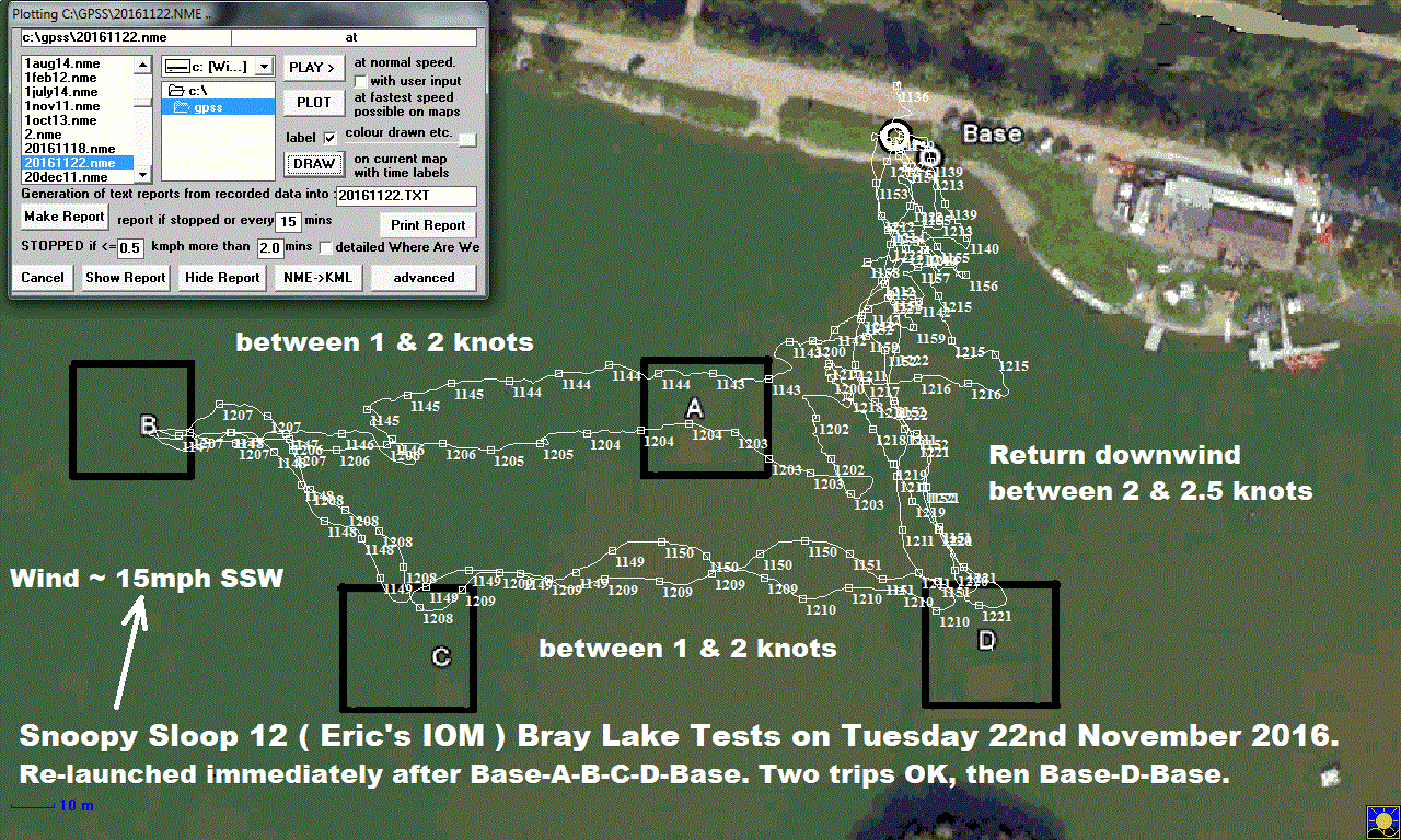 Boat6 ( yellow on left ): plugging in a TTS unit and switching on, made it speak "Autopilot for 28X2, 12th March 2016". Looking inside the Autopilot box we could see no compass and the old Globalsat BR355 GPS, used in all previous attempts. Looking at the "Change History" in the code, we can see that AP28X2D was after having two 24/7 waypoints on Bray Lake instead of one. AP28X2E removed Armitage Court waypoint, to make space for Goldsworth Park ones. i.e. our latest AP28X2F should be the same as that in Boat 6, other than the GPS. Boat6 then settled down into it's control cycle, steering to Bray Lake "A", saying speed was either 0.0 or 0.1 knots. This implies our old BR355 may have been accurate to 0.1 of a knot. i.e, direction errors no more than 45 degrees at 0.1 knots, decreasing to below 10 degrees above 0.5 knots real speed. Maybe the new BR355-S2 will be better: hence our wish for tests on this speed accuracy soon.