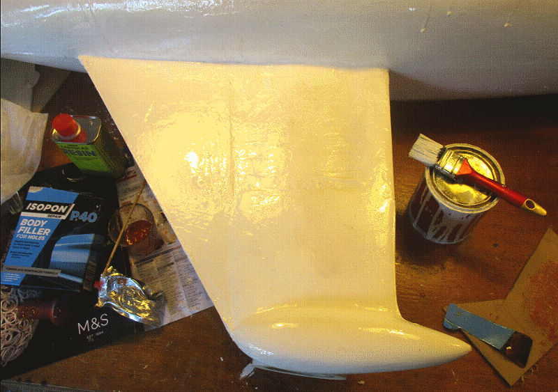 the fibreglass deck, so carefully put down, and glued with fast-glass resin to the original fibreglass hull,
