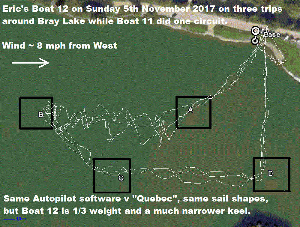 Boat 11 sailed reasonably straight cross wind, but with a fast zig-zag indicating over-steering. Boat 12, carrying Peter's TTS telemetry