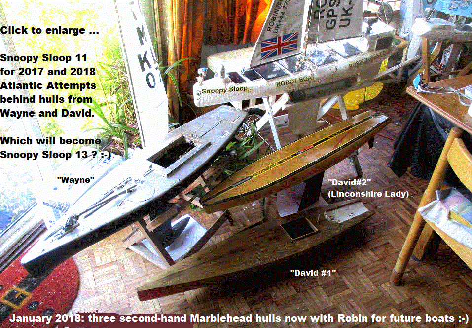 In December 2012, our priority was in finding Snoopy Sloop 8, and - if we did - having all the spares ready here to fix him. We were hoping to find, fix, and re-launch Snoopy before 1st January, so he was not disqualified from the Microtransat 2012 event. That's when I set up this page - to help myself remember some design detail ! Since boat 8 was never found, Snoopy needed another boat, and this next boat 9 was just like Snoopy Sloop 8 - the one that made the 2012 attempt. All boats were 24/7 tested for many months, before an Atlantic attempt.