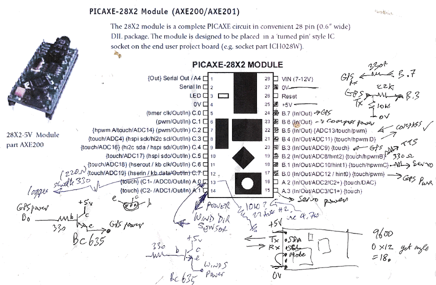 During August 2013, experimental work was started using an electronic compass. Details of this work are on the Compass page, which was expanded in July 2014, after starting work on a much better, tilt-compensated, compass. This work was closely coupled with use of a different, 28X2 Picaxe computer, with twice as much memory. Experiments were started on techniques such as "Power Switching" the sensors, such as compass and GPS, and even the servo, that moves the rudder. Another old page that may receive attention again soon, is the Wind Direction Sensor page. We got the solution to work, including "tacking logic" in the software, but after trials, the wind direction sensor was removed, because the power it consumed was not justified by significantly better upwind sailing performance.