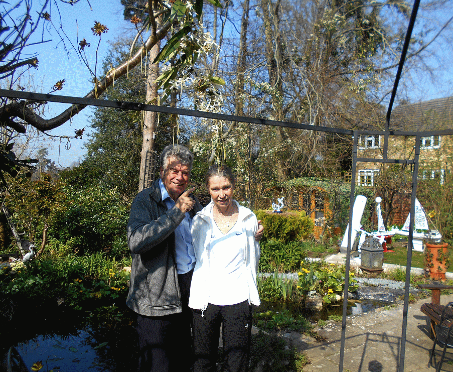 Robin and June pose proudly beside the Spaghetti Tree in their back garden