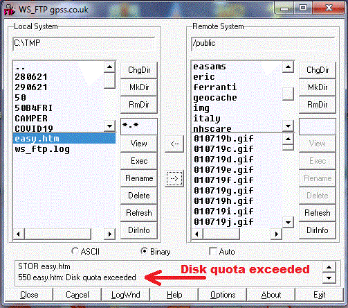 The problem I've hit is that WS_FTP response of "Disk quota exceeded", when trying to upload a small file like this easy.htm page.