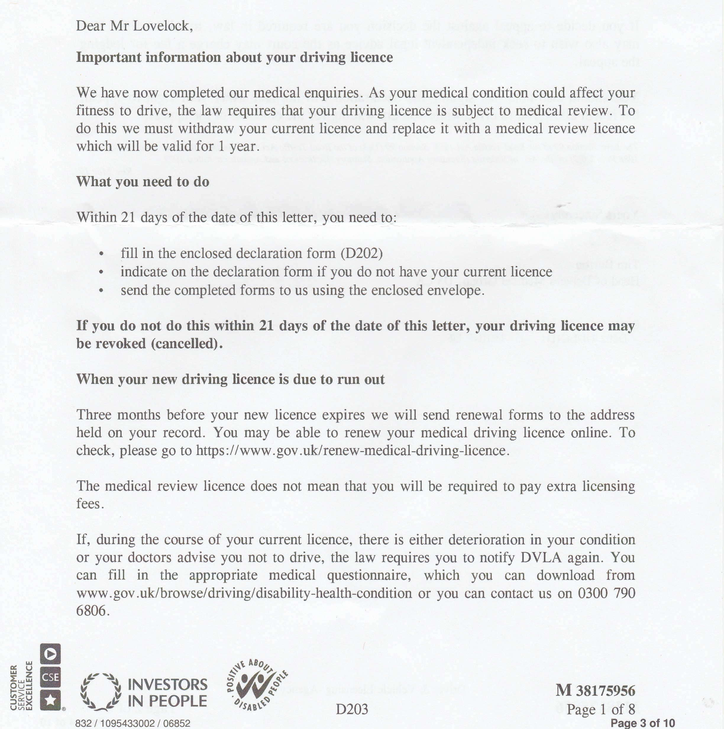 The above was 3 months ago. We recently received another (automated?) letter from "Tim Burton" of "Head of Drivers Medical Group". dated