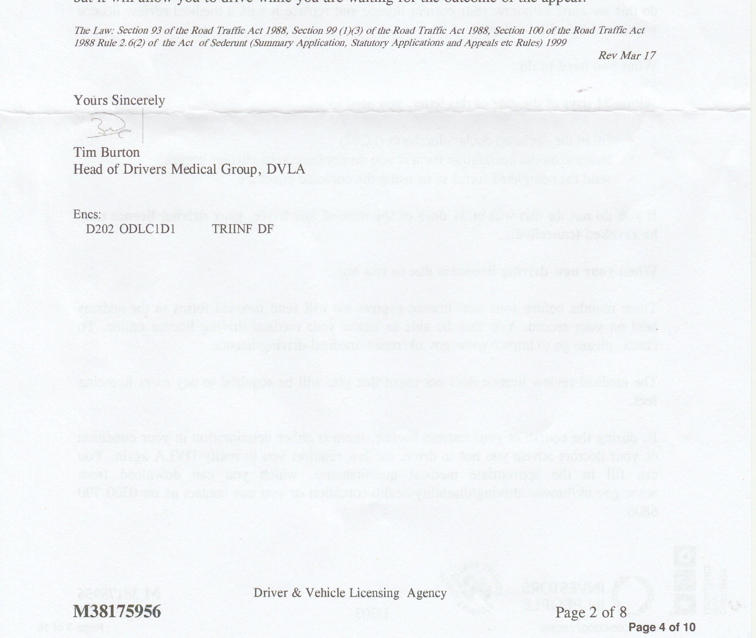 To: Tim Burton, Head of Drivers Medical Group, DVLA. Drivers Medical Group, Swansea, SA99 1DG, Wales.
