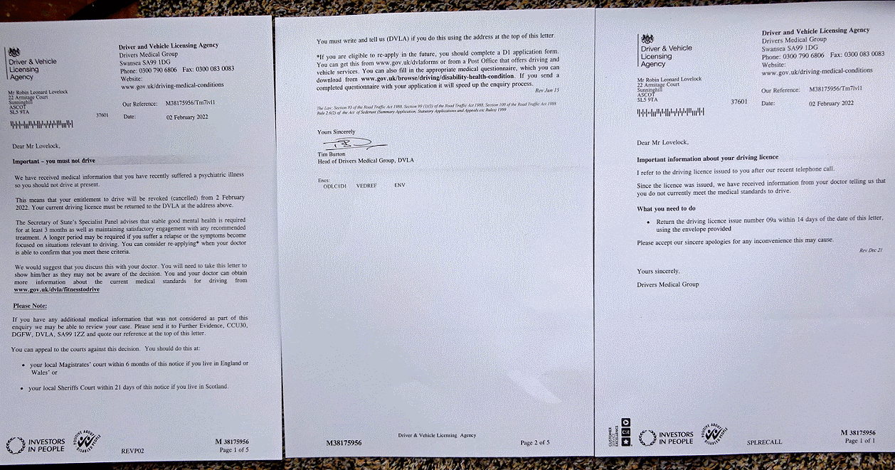 3. Letter from Tim Burton of the DVLA, on 2nd February 2022- "Important - you must not drive".