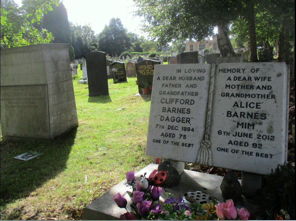 On Saturday 19th August, June did work agreed with her sister Gill: tidied the grave of Jack's first daughter Marian June Ponsford, who died at just 18 month old. This is where they had laid Jack's ashes. Click on these photos to enlarge. They include some relevant to Jack and Robin's discussions with others in Sunninghill. How best to clean that stone inscription ? Where is Jack's mother Minnie ? June recalls Jack saying she was down the end, but we could not find her. Maybe you can help ?