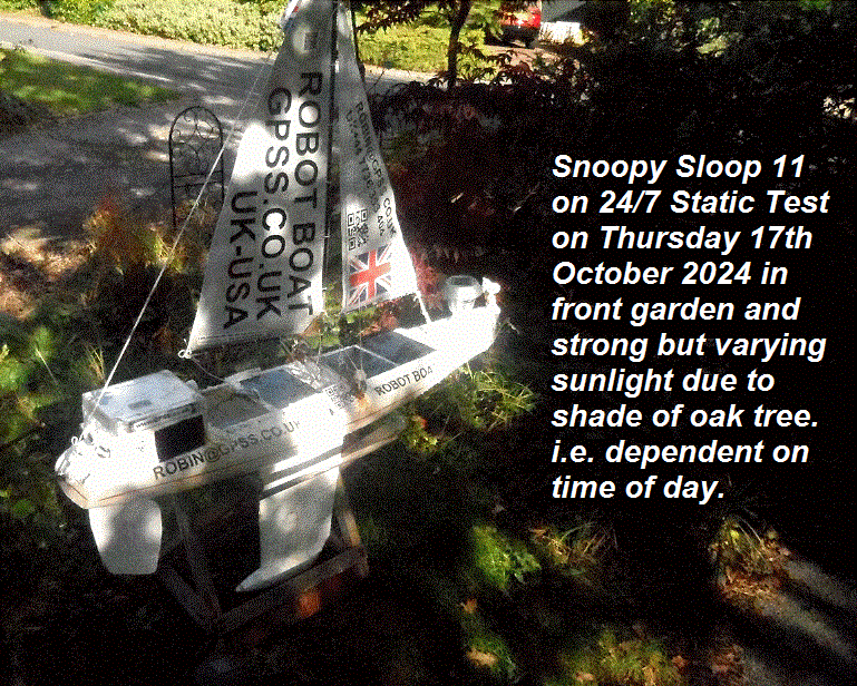 Monday 18th November 2024: Still not running after ~ 3 weeks. Voltages LHS & RHS ~ 2.36v -> 2.14v. So, SWITCH OFF, to recover strength. LEFT OFF SEVERAL DAYS. FROSTY NIGHTS; LEAVES FALLING OFF OAK TREE ;-) Thursday 21st November 2024: Boat switched ON at 1030. Voltages: LHS 5.22v, RHS 5.34v -> 5.06v. Cloudy, but sun later ? :-) Saturday 23rd November 2024: ONLY RAN ABOUT 8 HOURS, stopping at about 1830 Thursday. Brief movement when hit by sun later days. Today voltages: LHS 2.41v, RHS 2.41v -> 2.14v at 1150. Left switched on, with fewer leaves on oak tree to hide sun, each day ;-)