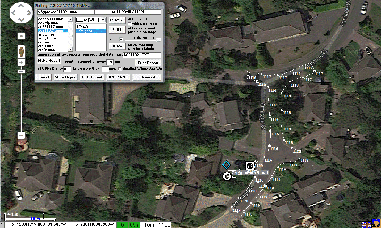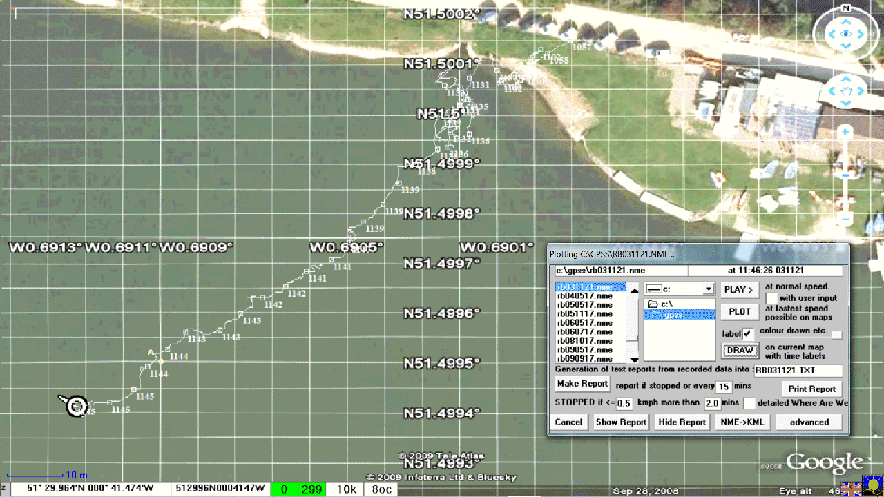 The I-GotU is seen having it's GPS tested by Robin's old GPS Software, GPSS.