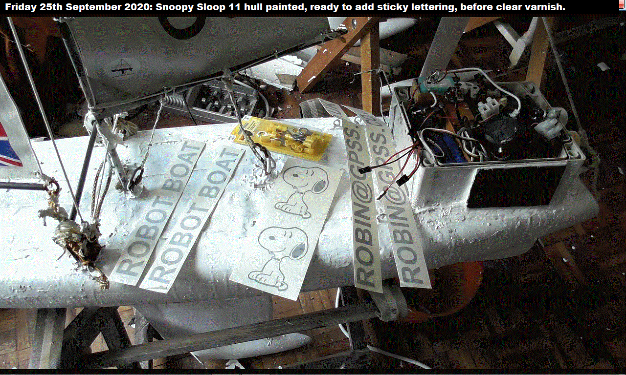 I have added stickers "Robot Boat", Snoopy cartoon, and "ROBIN@GPSS.CO.UK" on each side of hull. See below. Then I applied three coats