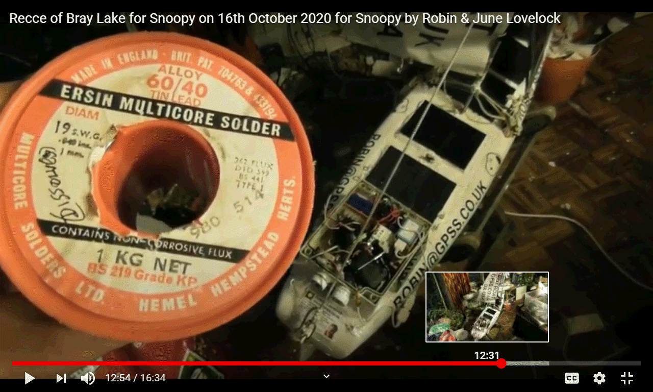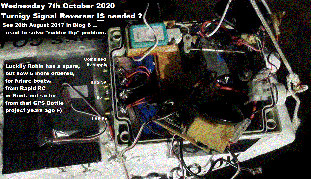 4th September 2019: This documents test and repair work on Snoopy's Boat 11, after that "Good" June 2019 Atlantic Attempt. Snoopy certainly surprised us, yet again, in racing Dick south, to the French coast, near Cherbourg, then returning north to end his adventure in Lulworth Cove. Robin's best guess at an explanation, of why Snoopy was not simply been swept westward, by the strong wind, was we must have a remarkably well balanced boat, with lots of "weather helm". We don't know when Snoopy's Boat 11 lost it's rudder, but with hindsight, it was a daft idea to use carbon fibre rod. It now has spring steel ! Thanks Peter for the check on the Autopilot software AA28X2R.BAS , to give us confidence that the autopilot would have being try to steer westward, after getting south of the "Channel" waypoint. Perhaps the boat was rudderless long before then ? Click on pictures to enlarge.
