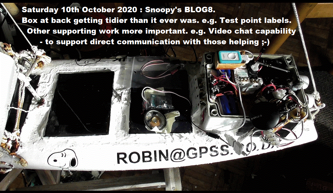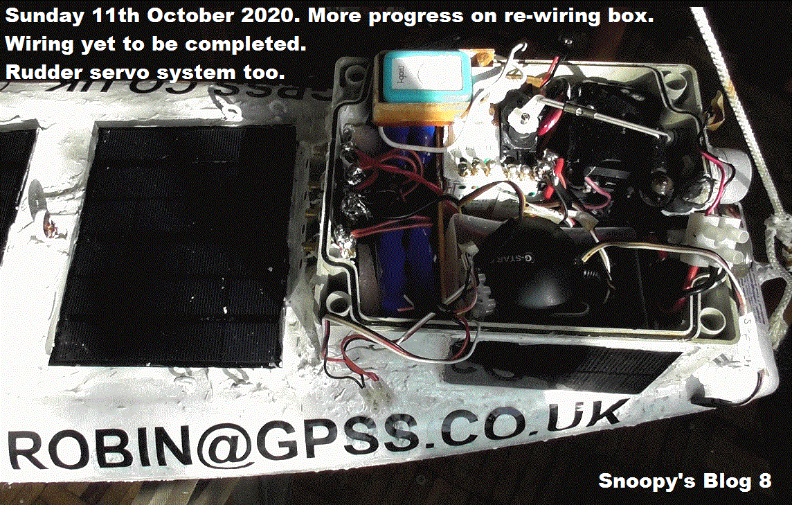 Tuesday 29th September 2020: "Snoopy Sloop" stickers have not arrived yet, but the picture below shows important work on re-wiring has started. The brass bolts should be more suitable than those nickel plated steel bolts. The solar panels are now wired through to the 5v 4xAA NiMHd battery packs. The LHS and RHS are duplicated: each two 5v packs in parallel. Now major work is needed in re-wiring towards the rear, including use of Schotsky diodes to combine LHS and RHS 5v supplies, and wiring through the duplicated power switches at the rear. This power is fed into the Picaxe Autopilot computer, but also used as a backup to the SPOT Trace power, which has it's own 5v pack. LOTS to do carefully, including checking for dry soldered joints !
