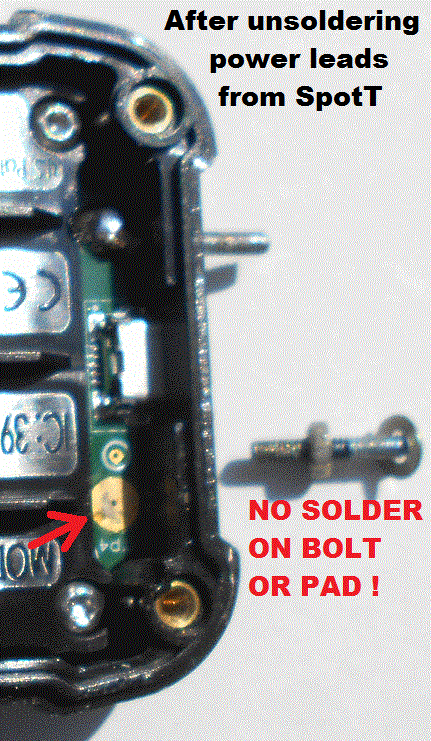 FAULT WAS POOR SOLDERING ? Closer inspection after unsoldering the power leads into SpotT revealed