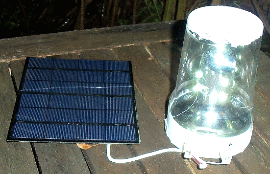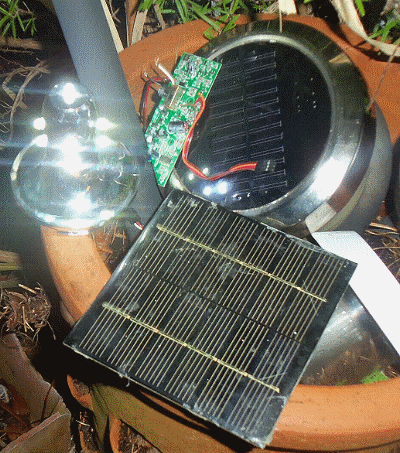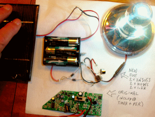 has been rewired onto the same type of small 6v solar panel, and a single 5 AA cell NiMHd pack. Voltages of