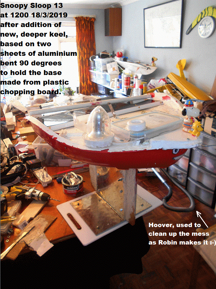 Here is Boat 13 after bolting two sheets of Homebase aluminium, 50 x 25 cm, bent at 90, either side of the old keel,