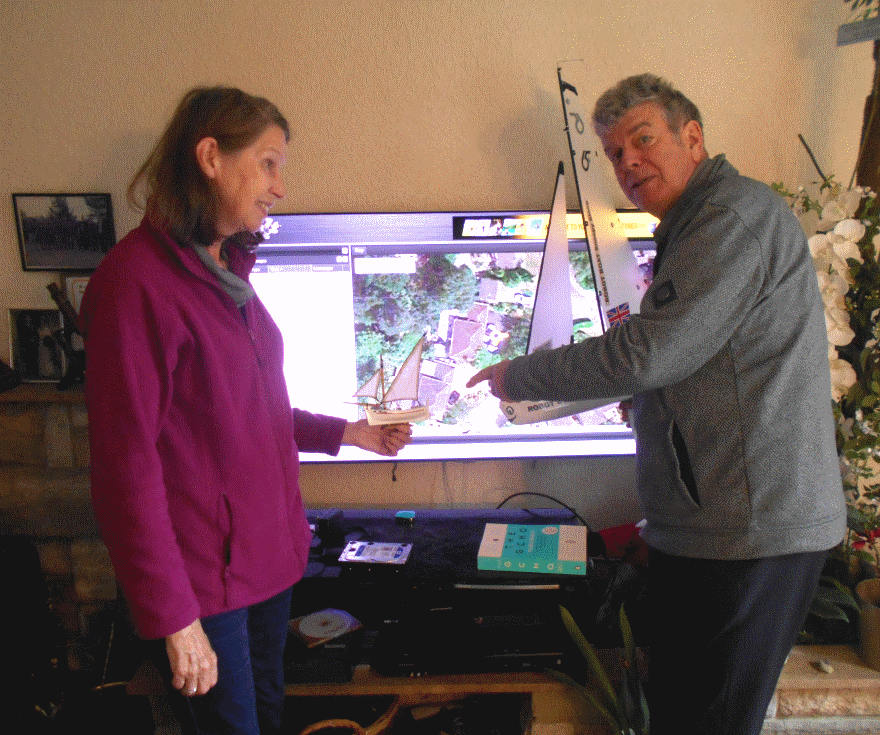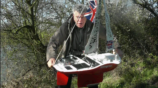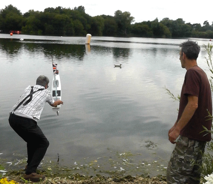 That's Robin, on the left, sat on the bank of Snoopy Corner, watching Snoopy Sloop 10 on 24/7 test (right), filmed by experimental Boat 6.