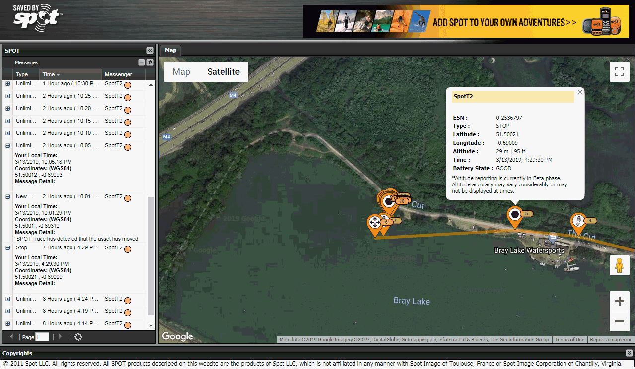 Saturday 15th June 2019: 7 weeks and both SPOT Trackers are still running ! SpotT in Snoopy's boat giving it's daily status report at 1024 BST.