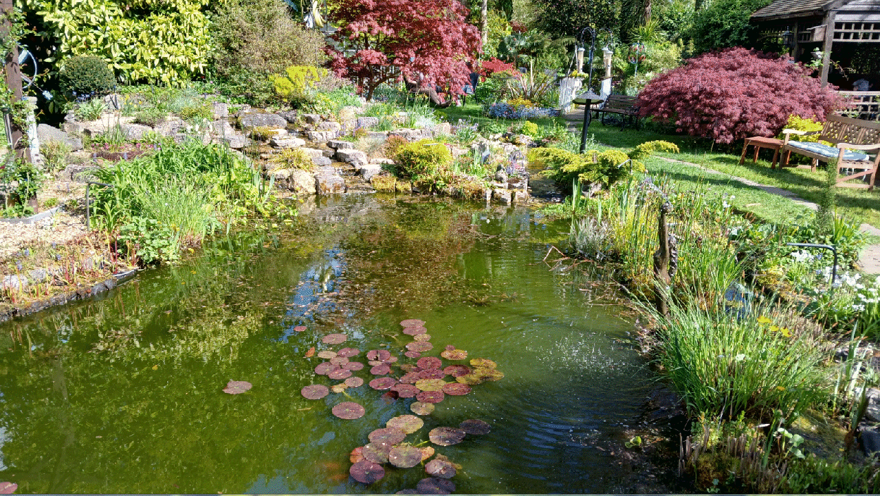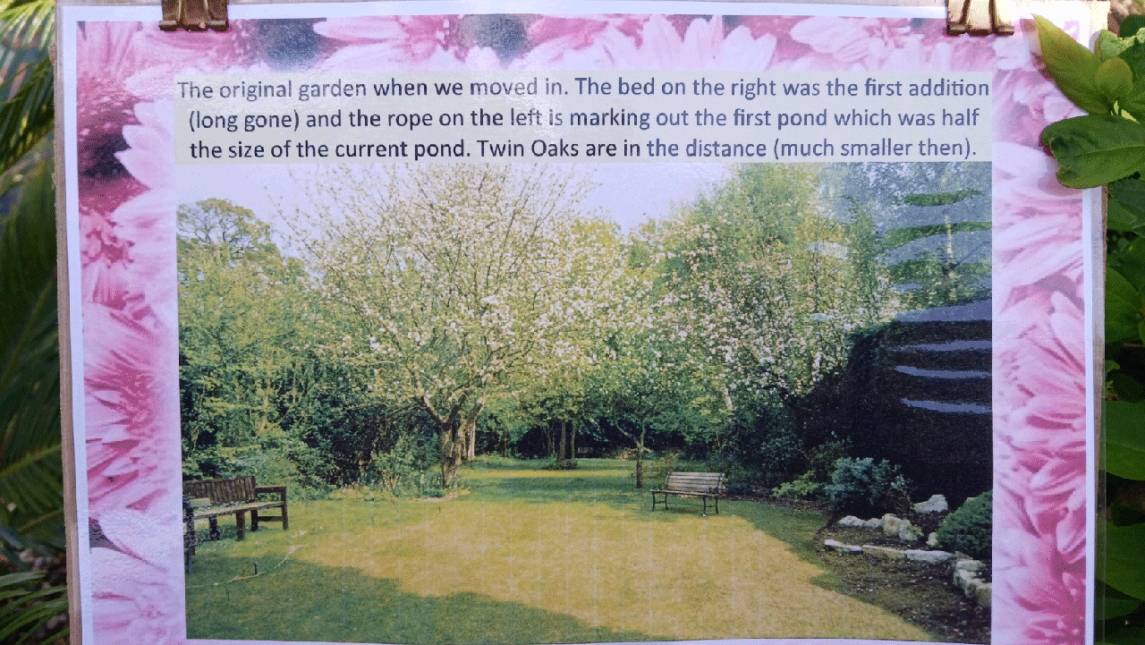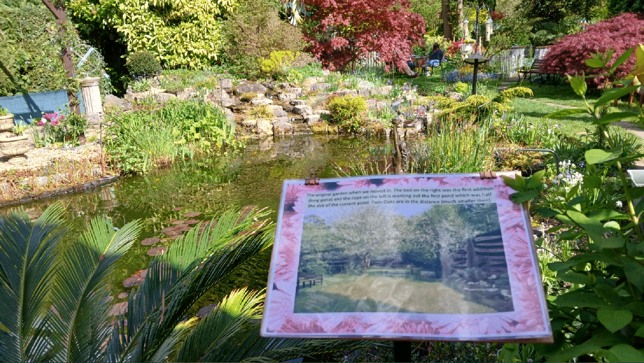 Tap or Click on these photos to enlarge. April 2026: Our trip down the M3; Our destination; History of the Water Garden; Those twin oaks and pond now ;-)